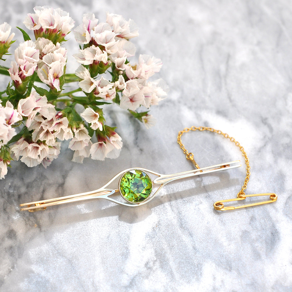 Edwardian 15ct and platinum stock pin with a round peridot to the centre in a rub over setting. With Safety chain. Circa 1910.
