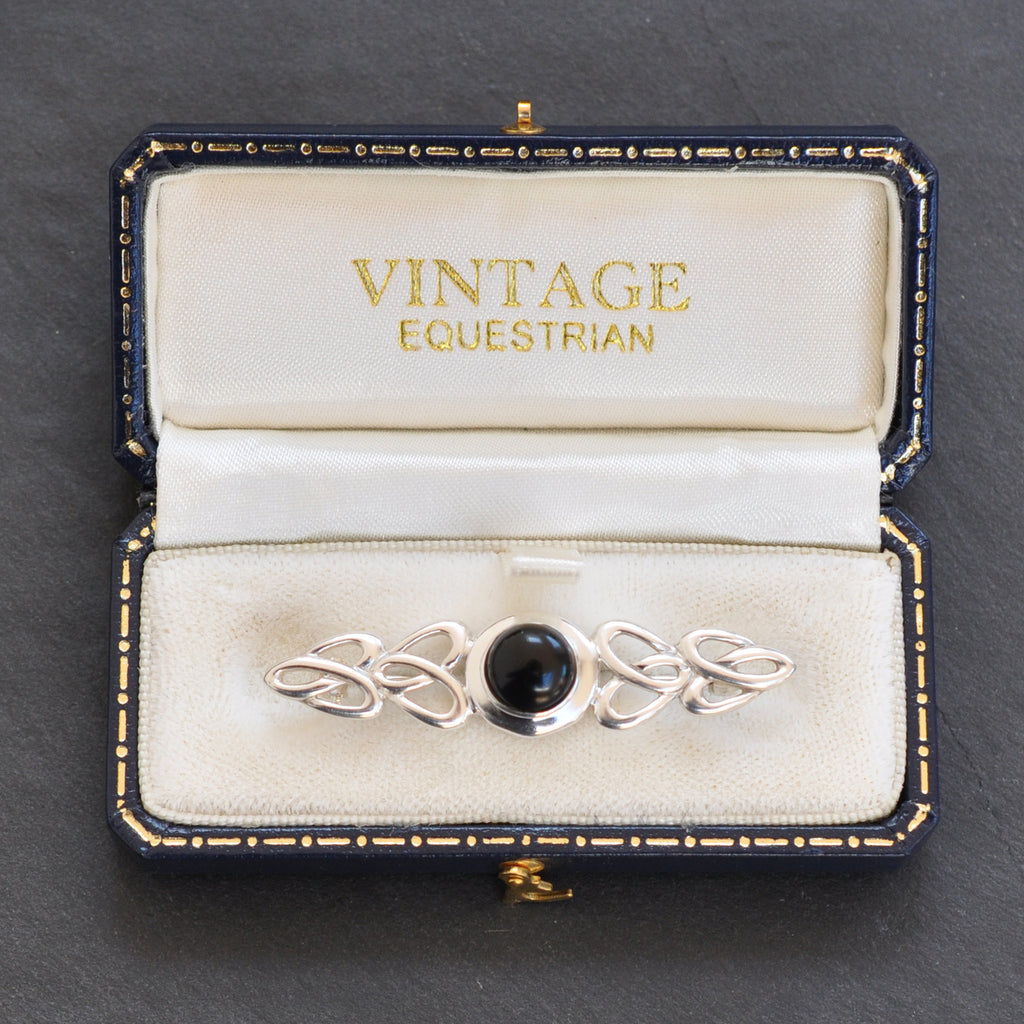 Silver Celtic style stock pin with a round onyx to the centre in a rub over setting.