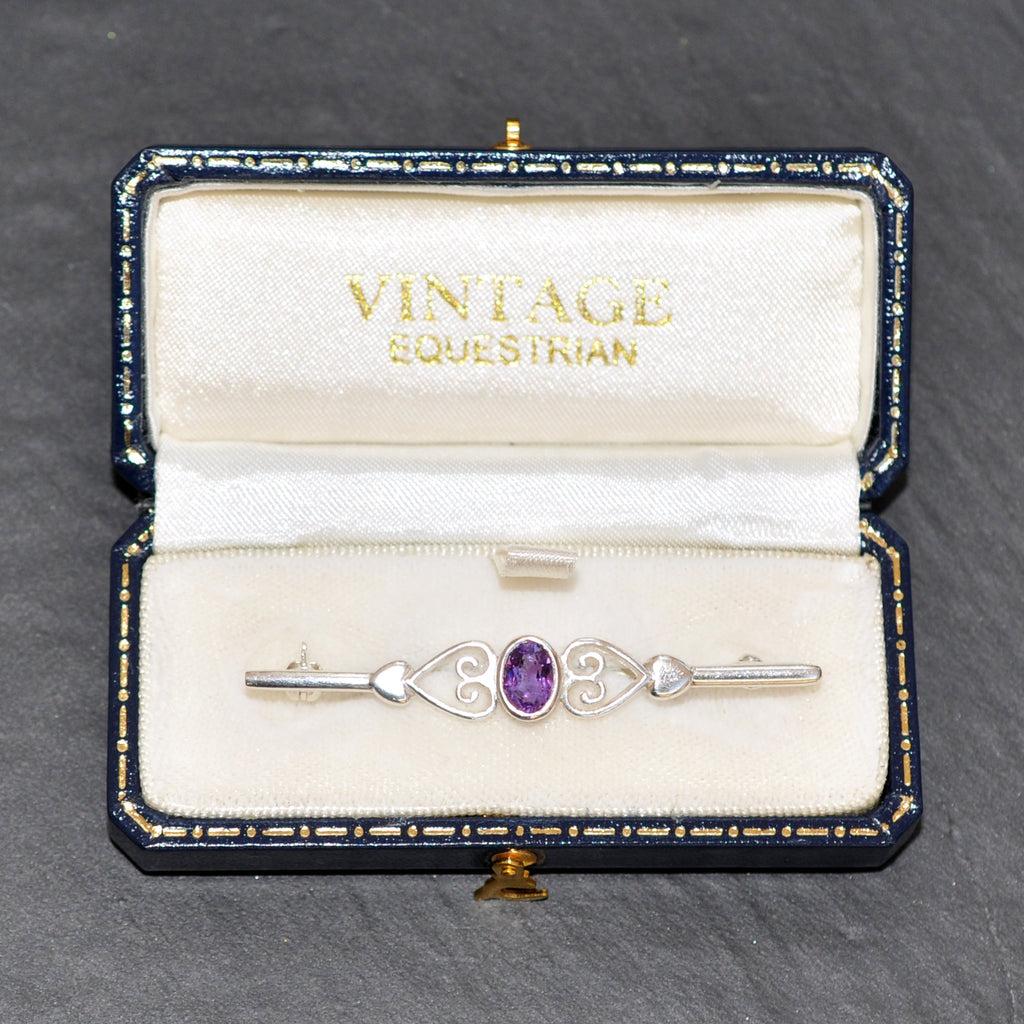 Silver fancy stock pin with a single amethyst to the centre in a rub over setting.