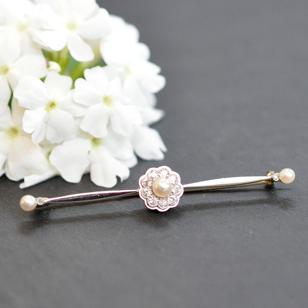 15ct Yellow and white gold bar with a pearl and diamond cluster set to the centre and a pearl and diamond to each end (total weight of diamonds approx 0.20 cts Colour H, Clarity SI2). Circa 1920s.